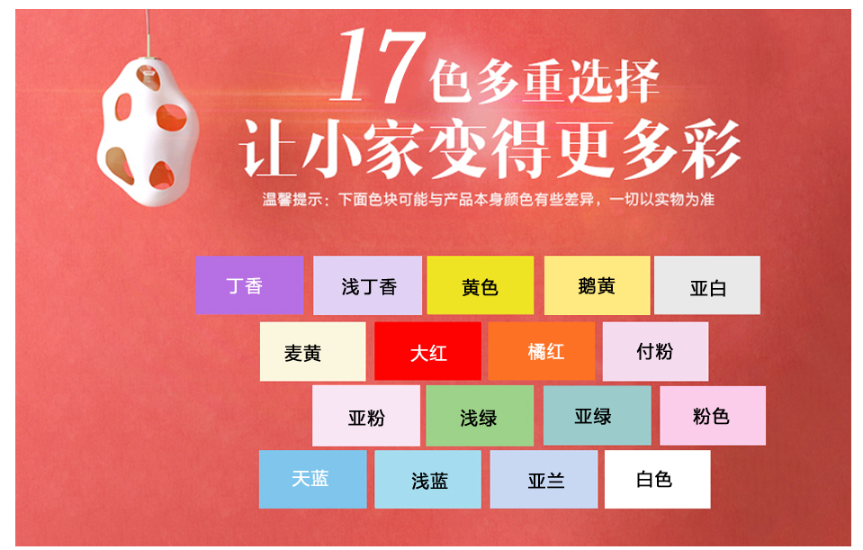 顏色:白色、黃色、耦荷、果綠、粉紅、天藍(lán)等17色多重選擇